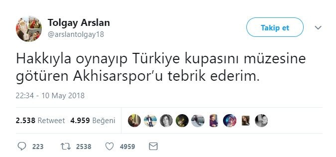 Beşiktaş'ın yıldız isimlerinden Tolgay Ali Arslan "Hakkıyla oynayıp Türkiye kupasını müzesine götüren Akhisarspor'u tebrik ederim" mesajıyla Akhisarspor'u tebrik etti.
