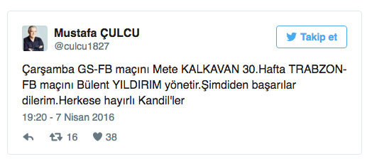 7 Nisan'da kişisel Twitter hesabından bir tweet atan Çulcu, 13 Nisan'da oynanan Galatasaray-Fenerbahçe derbisine Mete Kalkavan'ın, 24 Nisan'daki Trabzonspor-Fenerbahçe maçına da Bülent Yıldırım'ın atanacağını duyurmuş ve "Şimdiden başarılar dilerim" ifadesini kullanmıştı.