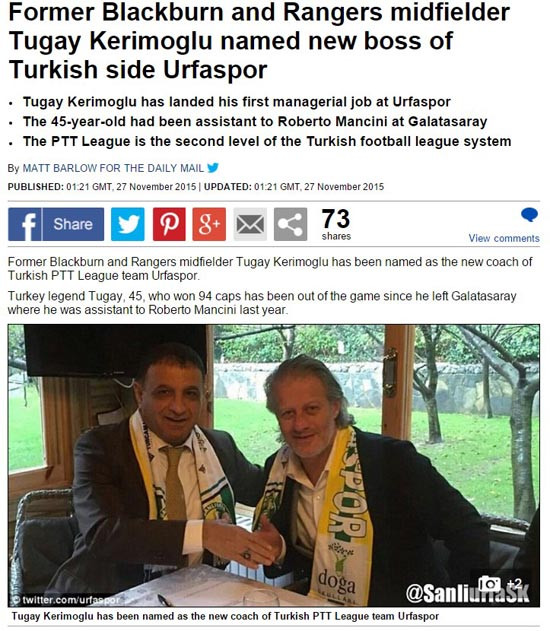 İngiliz Daily Mail'de yer alan haberde 'Blackburn Rovers ve Glasgow Rangers'ın eski orta sahası Urfaspor'un yeni hocası oldu' denildi.