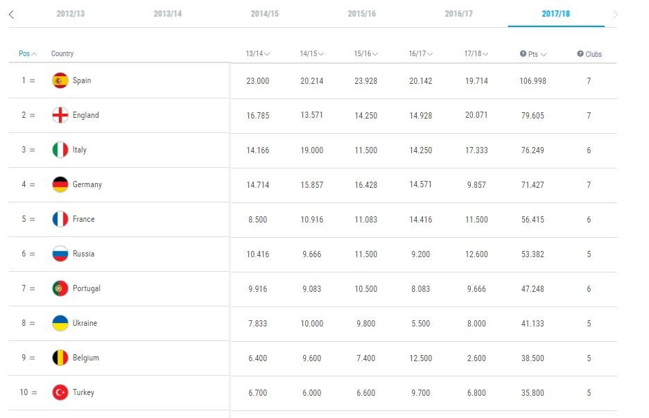 5. ve 6. ülkelerin şampiyon ve ikincileri direkt katılıyor, lig üçüncüleri ise eleme oynuyor. 7, 8, 9 ve 10. sıradaki ülkelerin ise şampiyonları direkt katılım hakkı kazanırken ikincileri Devler Ligi’ne katılmak için eleme mücadelesi veriyor. Türkiye’nin 6. sıradaki Rusya’yı geçmesi kısa vadede kolay gözükmezken en azından lig şampiyonun direkt olarak katılması durumumuzu korumak ve daha sağlamak almak ile takımlarımızın Avrupa arenasında daha az eleme oynaması açısından Belçika’yı geçmek şart.