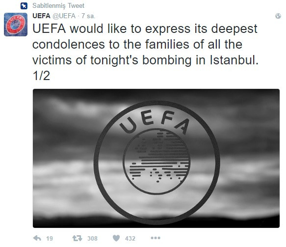 İstanbul'da Beşiktaş-Bursaspor maçının ardından meydana gelen terör saldırısı için UEFA başsağlığı paylaşımında bulundu