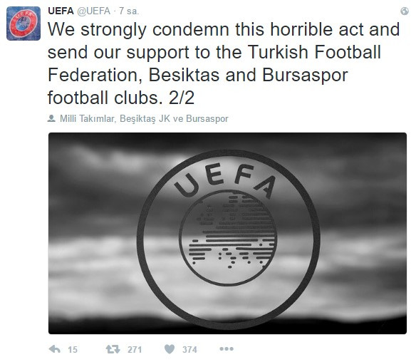 UEFA, resmi Twitter hesabından Beşiktaş-Bursaspor karşılaşmasının ardından yaşanan terör saldırısı için açıklama yaptı